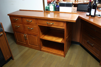 本体の右半分は、既存カウンターから大きく張り出している天板の下に入り込むため、こちらの天板は必要無いものの、本体だけは奥行が大きく延長されています。