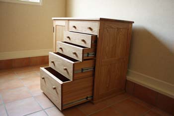 サイズは、高さ87cm、間口は天板で1m5cm、奥行きは同じく52cmと、さすが特注という、細かいサイズ設定です。小ぶりに見えますが、引出しは収納力たっぷりの深いものも含めて5杯。サイズは浅・中・深の3種類。 すべてにスライドレールが付いていますので、重い食器などを収めても楽々開け閉めできます。